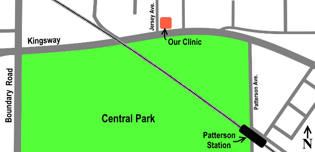 Located across Kingsway street from Central Park in Burnaby. Our Clinic is a 10 minute walk from Patterson Skytrain station. Our location has parking with an entrance off of Jersey Avenue. Including handicap access.
